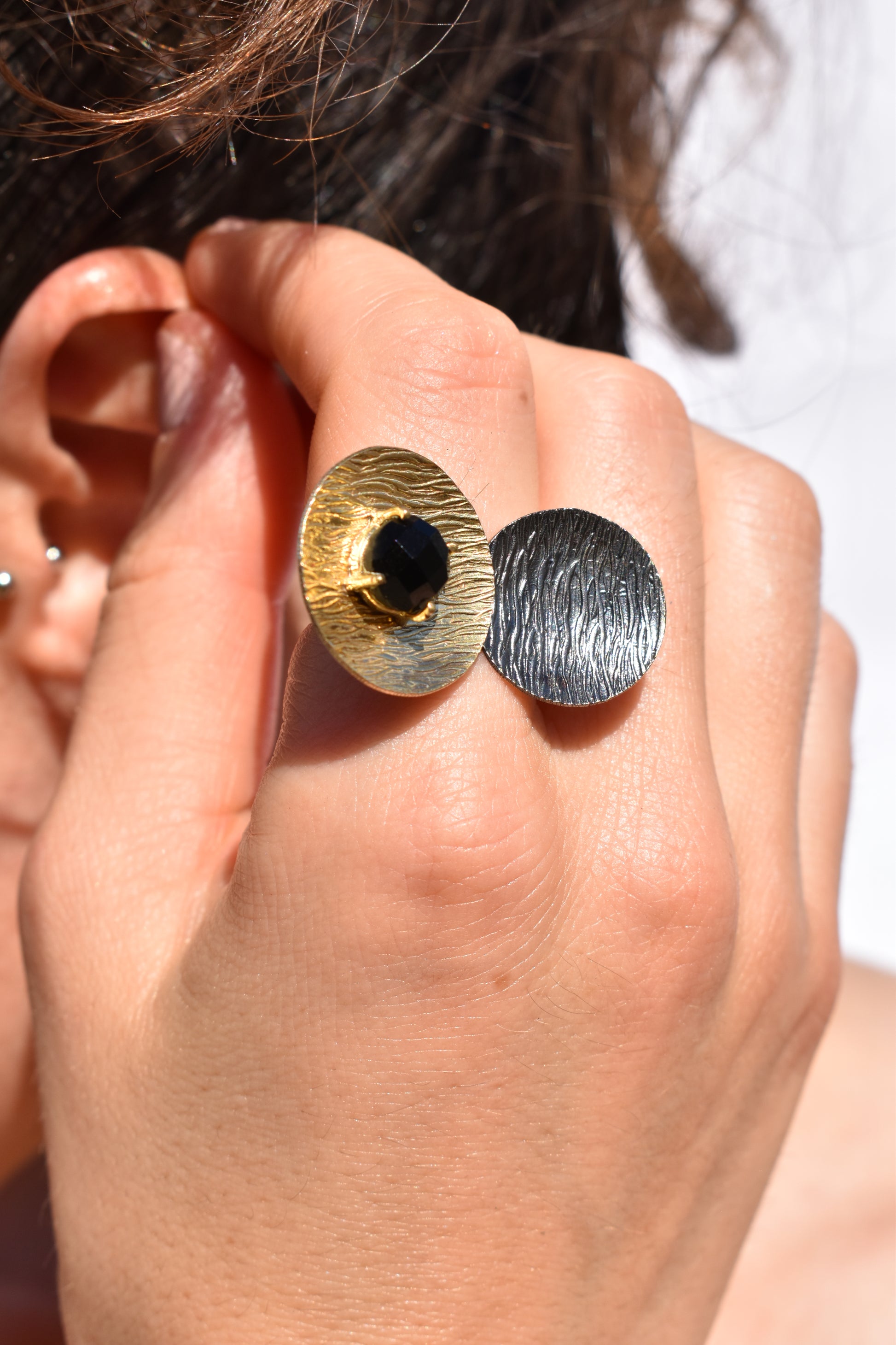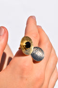 The Midnight Ring embodies bold sophistication, meticulously handcrafted with a deep black onyx stone set in striking 18K gold and black rhodium plating for a modern, powerful, and timeless look.